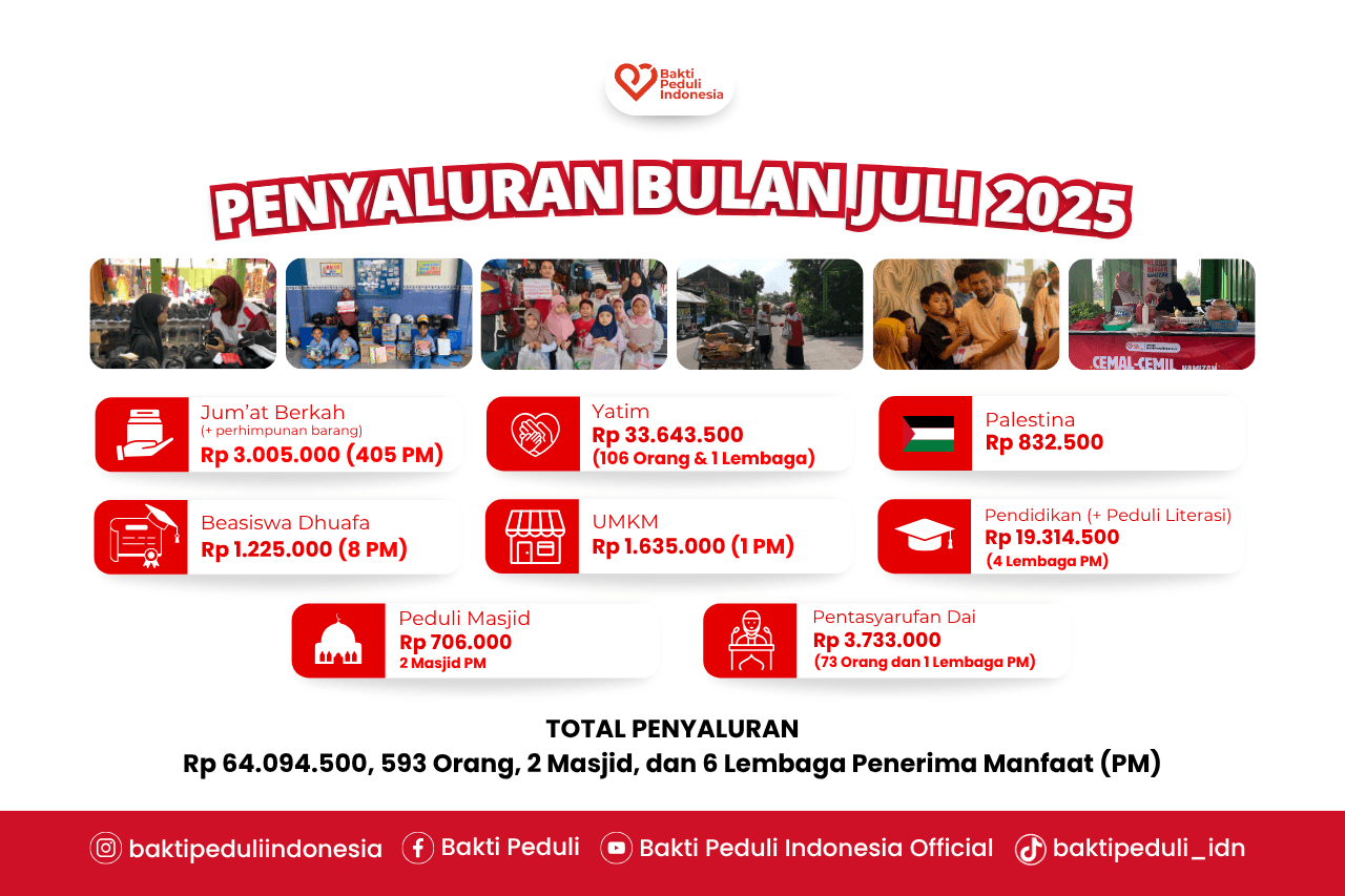 Alhamdulillah, penyaluran donasi Bakti Peduli Indonesia untuk bulan Juli 2025 telah terlaksana dengan lancar dan penuh berkah. Kami mengucapkan terima…
